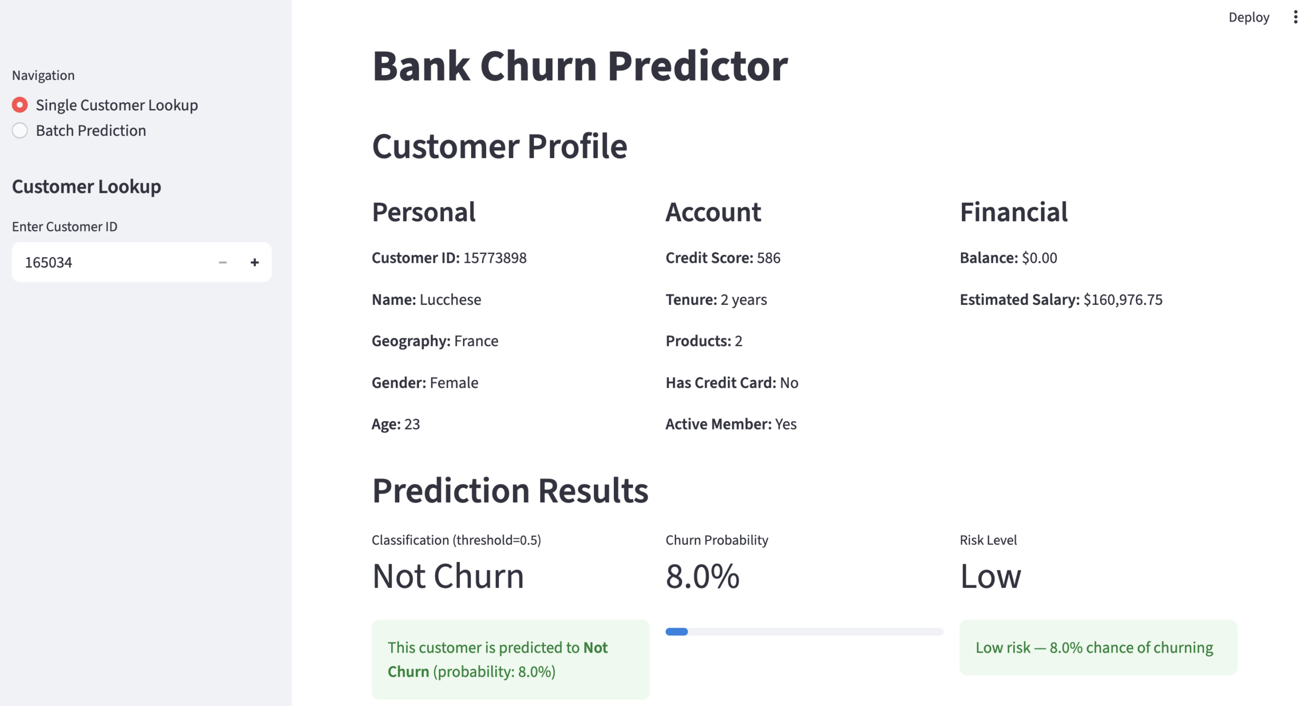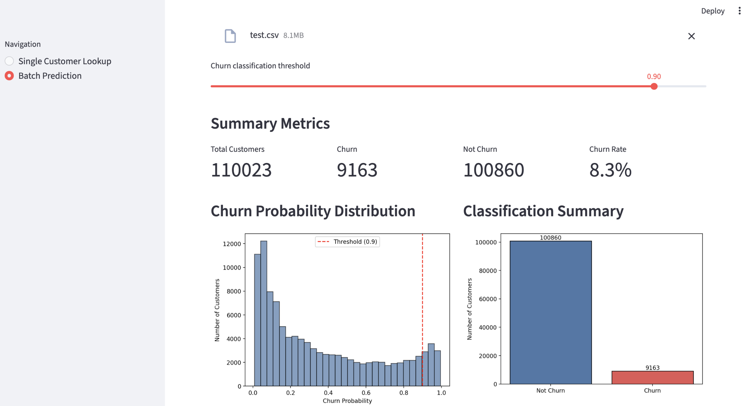 最初に私が何を開発したいかについて詳細なPRD(Product Requirement Document )を書きました。私が行ったのはここまでで、そこから先はClaude Codeをplanmodeで稼働させて実装計画を策定してもらい、私の承認後、そのまま実装へと進みました。Claude Codeが途中で許可を求めてくることがありますが、全てyesで問題なく大丈夫でした。実質的には100%AIエージェントがやってくれたと思います。実際に出来上がったGUIは以下の通りです。顧客IDを選択すればその顧客の離反確率が表示されます。離反しない顧客・離反しそうな顧客の例がそれぞれ出ています。