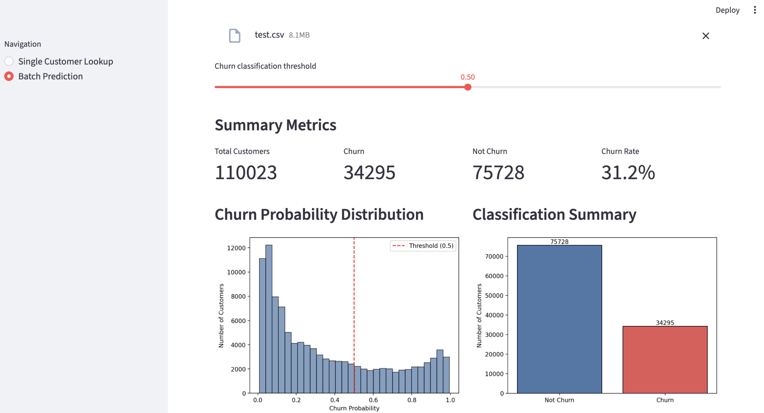 さらに顧客全体の離反傾向を知りたい場合は、バッチ予測のページに飛びます。ここで顧客データのcsvファイルを取り込めば、全顧客(約11万人)の離反確率による分布が出せます。また「離反確率が何%以上であれば実際に離反する」と言う閾値を設定できます。ここでは50%に設定しました。その場合の離反しそうな顧客の占める割合が31.2%となり、以下の様に出力できます。
